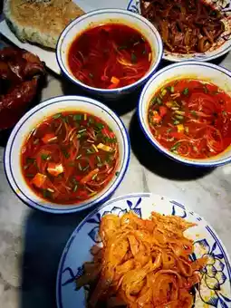 Photo tips: Take a top-down shot of a row of small bowls of red soup, capturing the moment when the noodles are picked up with chopsticks. Make your friends drool!