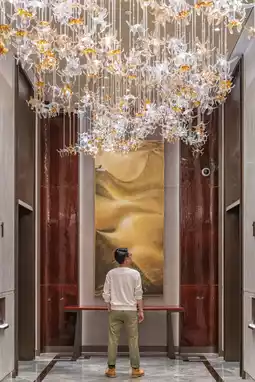 1️⃣The hotel incorporates many Minnan elements, such as the grand lacquer painting screen "City of Light" in the lobby, the hibiscus-shaped chandeliers, and the white marble carvings of the East and West Pagodas using Hui'an stone carving techniques—all cultural symbols of Quanzhou as a Maritime Silk Road hub.