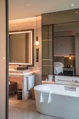 🛏️Room Highlights: Riverside rooms offer stunning views of the Jinjiang River, with the neon-lit Ferris wheel at night being a classic Quanzhou landmark. The room design blends local Quanzhou elements seamlessly, with Dehua white porcelain accents adding a special touch. Each room features a digital entertainment system for relaxation, rainforest-style shower facilities, and thoughtful details like capsule coffee machines, Kung Fu tea sets, and premium tea leaves—ensuring a comfortable stay.