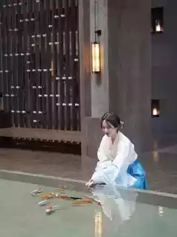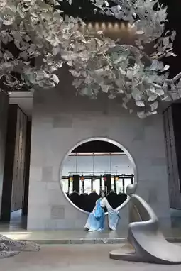 The entire hotel features a courtyard design, with every brick and tile exuding a rustic charm. In the lobby, the hollow ginkgo tree shape is uniquely ingenious, with famous quotes from the "Analects" hidden between the bark textures. The lecturing statue on the side seems to travel through thousands of years, telling you the wisdom of the sages. Change into a flowing Hanfu dress, stand next to the hollow ginkgo tree in the lobby, and let the "Analects" characters be the background, showing an elegant temperament in every gesture. Leaning against the semi-circular white jade gate, you can see the reflection in the water outlining the auspicious sign of "Fu Lu" (fortune and prosperity), and every photo you take is an ancient-style blockbuster. Strolling along the inkstone waterscape, your clothes fluttering in the wind, perfectly interpreting the artistic conception of "the highest excellence is like that of water."