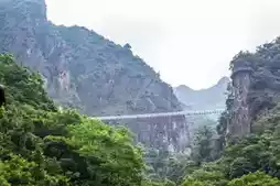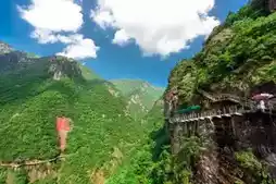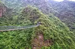 Tianji Longmen is a dragon-shaped barrier! It includes Flying Dragon Plank Road [an 1800-meter cliff dragon coiled with clouds brushing your fingertips like cotton candy assassins], Flying Sky Cable Bridge [a 108-meter iron cable bridge swinging wildly], and Longtan Flying Waterfall [enter the 205-meter waterfall shower area]!