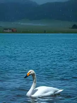 Swans swim gracefully in the rain, their white feathers intertwined with the rain curtain. Occasionally, they flap their wings, splashing water. Flowers and plants by the lake sway gently in the rain, emitting a faint fragrance.