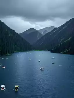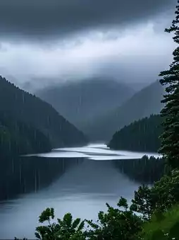 Fine rain falls, and ripples spread across the lake, like countless lively notes. In the distance, mountains loom through the mist, like fairies wearing thin veils, adding a touch of mystery. The rain washes the forest, making it even more lush and deep. Crystal-clear water droplets hang on the pine needles, reflecting colorful light.