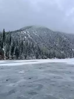 The hike from Lower to Upper Kolsai Lake in late spring was easier than I expected— the ground still frozen hard and lined with patches of stubborn snow that refused to melt. As we climbed higher, the air grew colder and the forest thinned a little opening up to dramatic views of the surrounding peaks still dusted with snow. When we finally reached the Upper Lake, it felt like stepping into another season entirely. The lake was almost completely frozen, a smooth, pale sheet of ice with just a few dark cracks and edges where the thaw was beginning. It was hauntingly beautiful—quiet, remote, and still gripped by winter despite the time of year.