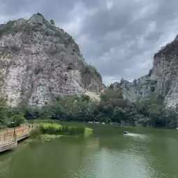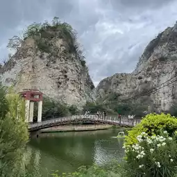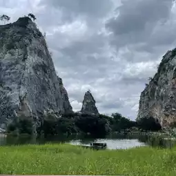 Khao Ngu, also known as Khao Ngu Stone Park, is located in the limestone mountain area within Khao Ngu Public Park in Ratchaburi Province. This place was originally a quarry site. Inside the park, you'll find rocky cliffs and small ponds, which can be seen from afar. For activity enthusiasts, the park also offers paddle boat cycling, ensuring a delightful atmosphere. The entrance to Khao Ngu Public Park features a long riverside bridge for strolling and enjoying the scenery, making it a perfect spot for relaxation and taking chic photos.