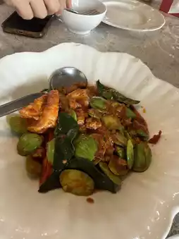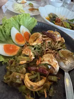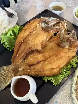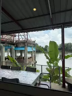 This Thai restaurant has a great atmosphere, located on the banks of the Mae Klong River. The atmosphere is open and airy, perfect for a relaxing evening with a river view. I stopped by this restaurant in Ratchaburi Province because of its good reviews. You can choose between an air-conditioned room or an outdoor dining experience. The food is fresh, high-quality ingredients, and the prices are reasonable. Today, we ordered crab curry, fried sea bass with fish sauce, winged bean salad, papaya salad, fried shrimp salad, and shrimp stink beans. The flavors were delicious, packed with ingredients, and the flavors were intense. The fish was fresh and the shrimp were crispy and bouncy. Almost every dish we ordered was delicious. If you're in Ratchaburi Province, don't miss this restaurant! Highly recommended!