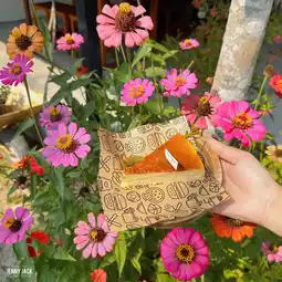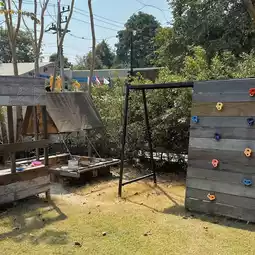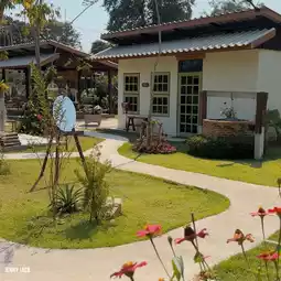 The shop is called 𝗭𝗲𝗿𝗼 𝗦𝘁𝗿𝗲𝘀𝘀 𝗖𝗮𝗳𝗲 𝗮𝗻𝗱 𝗚𝗮𝗿𝗱𝗲𝗻 (Stress = Zero). It is a wooden house-style cafe with a shady atmosphere. It feels like visiting your grandmother in the province. We like this place. There is a garden corner, a swing, a sand house, a playground, and activities for children to collect organic eggs (a great activity).