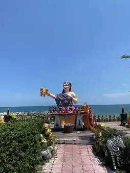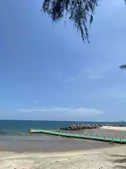 Here it is! Saeng Chan Beach in Rayong! The atmosphere is absolutely delightful 💕. Feel the cool sea breeze, enjoy the clear blue skies, and marvel at the turquoise waters. Perfect for those who love to chill and take stunning photos 🌅. The beach offers plenty of photo spots, including the iconic sculptures inspired by Thai literature, such as the magnificent 'Butterfly of the Ocean' 🧟♀️ and the serene 'Hermit' 🧙♂️ sitting nearby.