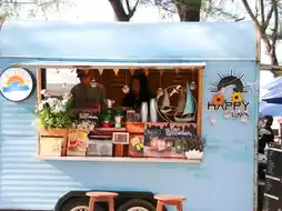 🏝️Happy Lava is a coffee shop by the sea in the form of a food truck in pastel blue. They serve coffee, cocoa lava, and many other drinks. Toasted bread on a stick, crispy on the outside, soft on the inside, fragrant, is another menu that you shouldn't miss.