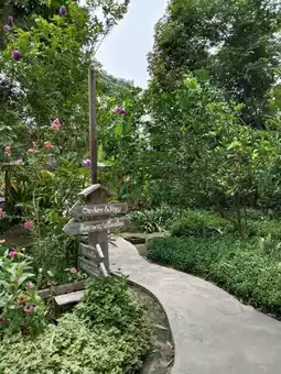 There are also outdoor photo spots, one in front and one behind the pond, which offer a beautiful view of the flower garden. There are also two other buildings with air-conditioned seating, beautifully decorated.