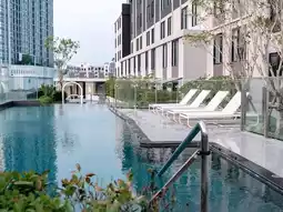 The Holiday Inn Express Rayong, a modern IHG property nestled within the Map Ta Phut industrial area: Top-left & bottom-left: The stylish exterior, showcasing the property’s clean architecture and inviting pool. Top-right: A cozy, well-appointed guest room blending comfort and functionality. Bottom-right: The sleek outdoor pool area—relaxing and well-maintained.