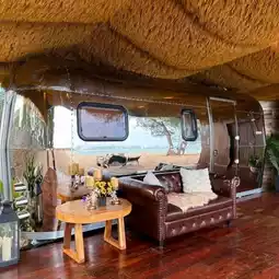 Starlit Sand Glamping, a glamour-themed campervan accommodation located right on EOD Beach. The silver color of the campervan reflects the sea, so beautiful! Taking photos from the front of the campervan is incredibly glamorous. The interior of the campervan is fully equipped with amenities, but the bathroom is separate from the vehicle itself. Showering with the curtains open is truly breathtaking.