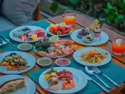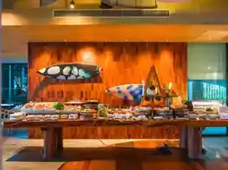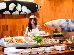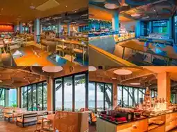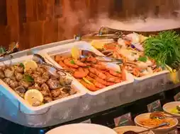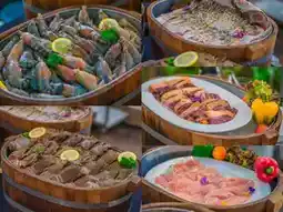 This time, we enjoyed an international buffet by the sea. The price is just over a thousand baht per person at the Ocean Wing. The buffet features seafood like shrimp, blue crab, oysters, sushi, sashimi, and even a seaside barbecue. The food selection is extensive, including a cheese room with a wide variety to choose from, as well as spicy salads, pasta, Thai dishes, snacks, desserts, and plenty of beverages. You can dine while watching the romantic sunset by the sea, accompanied by live saxophone music every Saturday from 6:00 PM to 10:00 PM. Location: Mercure Rayong Lomtalay Villas & Resort.