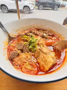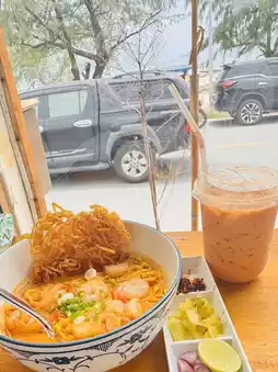 A chic beachside cafe with a breathtaking seaside atmosphere and refreshing drinks that will keep you chill all day long. 🍹 In addition to coffee and beverages, they also offer a selection of Northern Thai dishes. 🍜 Enjoy khanom jeen nam ngiao and khao soi, both delicious and flavorful. Don't miss it!