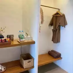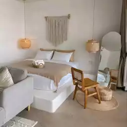 🏨 There are several room types here, each spacious and beautifully decorated in white and brown tones, complete with woven wood furniture.