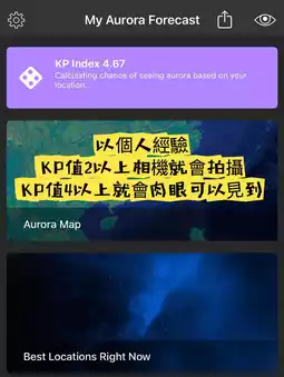 With the Aurora app, once you download it, it will send you a notification if there’s aurora activity in your area. This makes it almost foolproof for aurora hunting. If the KP index is above 2, your camera can capture it. If it’s above 4, you can usually see it clearly with the naked eye. You can also check the app to see the percentage chance of spotting the aurora in your location. If it’s orange or red, the chances are very high.