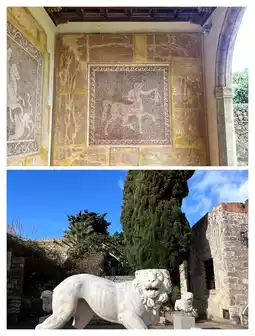 Stroll along the Old Town's coastline, the sea breeze gently caressing your face, bathed in the Mediterranean sun. Soon, you'll arrive at the Sea Gate. Continue forward and turn left to reach the Archaeological Museum of Rhodes. Hidden within the museum's second-floor garden are exquisite mosaics. Having withstood the test of time, their colors remain vibrant, each one narrating an ancient tale, a testament to the artistry of bygone eras.