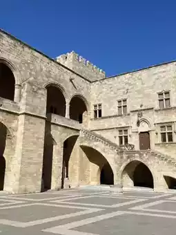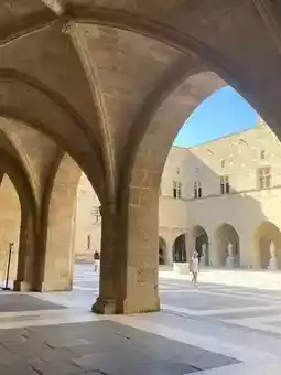 Continue to the Grand Patriarch's Palace (Address: Ippoton, Rodos 851 00). Arriving early is recommended, as hours are longer from August to October, so plan your visit early. The palace itself is richly decorated, showcasing numerous medieval knightly artifacts. The unique rooftops, corridors, and stained glass windows are all highly photographed, making it a popular spot for photo opportunities. Please note that the museum is closed on Mondays, Wednesdays, and Sundays, so be sure to check the opening hours.