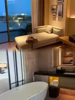 Must-book the ocean-view suite!🌅 The panoramic balcony faces golden sands🏖️, while the bed’s silk embroidery of *The Tide*🌊 lulls you into wave-filled dreams~🛌 The bathroom features full marble walls + a smart bathtub🛀, perfect for watching yachts glide by~🛥️ The living room includes a stargazing telescope🔭, paired with Rizhao green tea and mackerel dumplings—even daydreaming feels poetic~🍵 The AI voice assistant even announces tide times!🌊