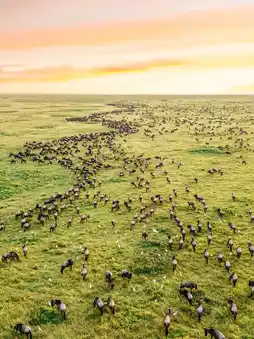 A life-defining moment! Watch wildebeest herds shatter the morning mist from above—unforgettable.