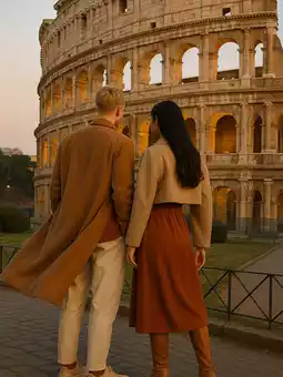 ✨ Lost in Rome’s golden dusk, we stepped off at Colosseo Metro Station, hand in hand. 🏛️ We wandered past the arches of the Colosseum, feeling the ancient stones hum with stories.