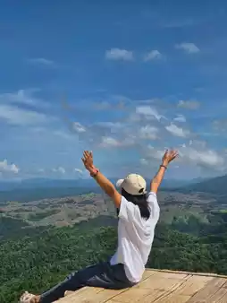 Phu Thap Fa 360 Degrees is a cafe serving tea, coffee, various beverages, milk and butter snacks, and rice porridge. It also offers camping-style accommodations with a 360-degree view, offering both sunrise and sunset views. At night, the stars shine brightly and beautifully. It's truly beautiful, so beautiful you won't be able to sleep! But Som Sri slept all day. With such a wonderful atmosphere, how could she not relax? Som Sri said.