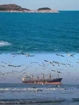 Seagulls soar, fishing boats dot the sea, Weihai, a flowing painting.