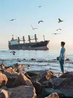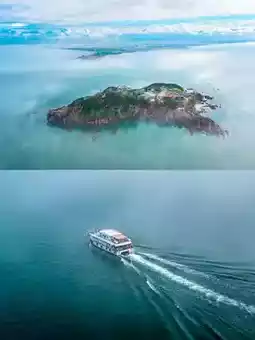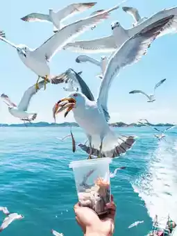 Boat tour to feed seagulls up close. The dock also has stranded ship Fortuna Goddess—stunning at sunset~