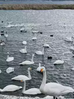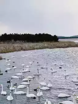 ▪️ Drone shots of "swan flock and shipwreck in the same frame"! Social post caption: "Unlocking the joy of hidden achievements"