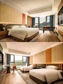 The guest rooms are the core narrative of this cultural journey. Opening the door, the warm texture of wooden elements greets you, intertwined with natural light streaming through large glass windows to create a comfortable atmosphere. In the deluxe rooms, the blue and white bed runner is a finishing touch, its traditional patterns seemingly telling ancient stories. The oversized floor-to-ceiling windows frame the city and distant mountains like a dynamic painting—watch the sunrise at dawn and the sunset glow in the evening, where the beauty of nature and indoor elegance blend seamlessly.