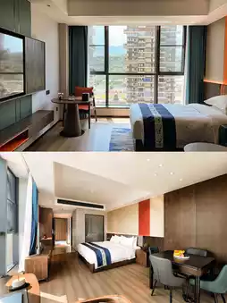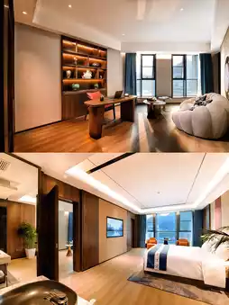 The executive suites elevate spatial aesthetics to a new level. The orange-red genuine leather sofa stands out against the wooden tones as a visual focal point; uniquely shaped round coffee tables and single lounge chairs provide cozy corners for business meetings or leisure breaks. The highlight is the special room equipped with a mahjong table, combining traditional board game culture with modern accommodation, satisfying guests' entertainment needs while integrating traditional culture into daily life with vitality.