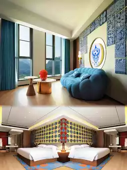 Stepping into the hotel lobby feels like entering a "museum of Qian-style aesthetics." In the more than ten-meter-high space, the wooden dome ceiling is paired with chandeliers featuring Miao silver patterns, where light and shadow reveal both solemnity and vitality; the resting area on one side is inspired by the Dong drum tower, with rattan chairs and batik cushions, and local bamboo tea sets placed on the side tables. Pour a cup of high-mountain cloud mist tea, and with the soft sound of the lusheng flute in your ears, the fatigue of travel instantly dissolves in this slow-paced elegance. Outside the floor-to-ceiling windows, the flowing water and rockery in the courtyard complement the distant green mountains. On sunny days, watch the sunlight spill over the green tiles; on rainy days, enjoy the rain hitting the banana leaves—each scene is a collectible view.