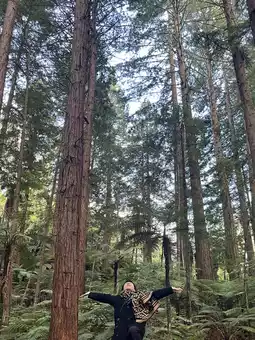Find the largest redwood tree, stretch your arms to hug it or lean against the trunk and look up.