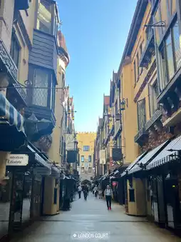 A shopping arcade lined with medieval European-style buildings. Perfect for strolling and photography. 📸