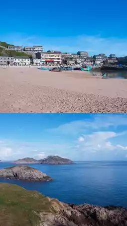 Highlight: At high tide, it faces the main island across the sea; at low tide, a stone path appears. The lawn, stone houses, and sunset create a fairy-tale scene.