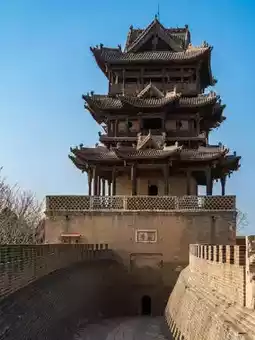 Guanque Tower, one of China's four great historical cultural towers, stands on the eastern bank of the Yellow River in the ancient city of Puzhou, Yongji. Built during the Northern Zhou Dynasty by Yuwen Hu as a military watchtower, it was named after the storks that often perched there. In "Dream Pool Essays," Northern Song scholar Shen Kuo described it as "Three stories high, overlooking Zhongtiao Mountain and the Yellow River below." The famous poem "Climbing Guanque Tower" by Wang Zhihuan—"The sun sets behind the mountains, the Yellow River flows into the sea. To see a thousand miles further, climb another story higher"—brought it enduring fame.