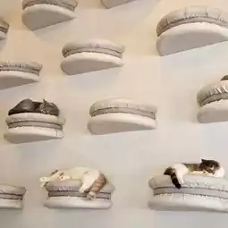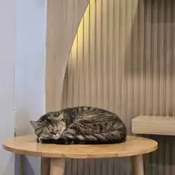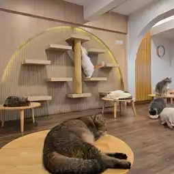 A small cafe decorated in white, cream, and minimalist tones. Inside, there are fluffy cats surrounding us, giving us the most enjoyable time to chat and play.
