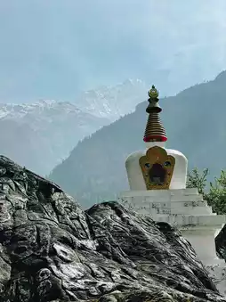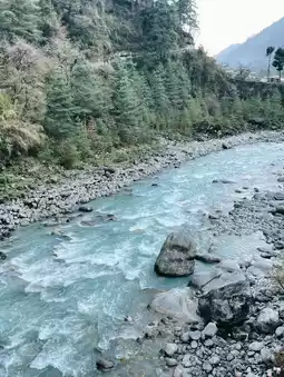 🌿 Surrounded by pine forests, with riverside lodges and prayer wheels humming.
