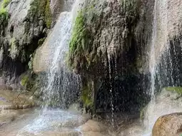You can swim in various spots, but the water isn't very wide. The highlight is the large, crystal-clear blue waterfall, perfect for taking photos. There are also places where you can lay down mats for a meal. Parking is available along the roadside.