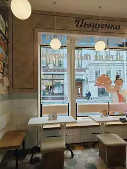 I stopped in to try some pimps at "Pyshechka" by Ginza Project. The price was reasonable (32 rubles each), and the service was lightning fast. β‘ Delicious, golden-brown, and hot β a taste of childhood for many Russians! I took some with me, which is why they're in a bag in the photo. π
