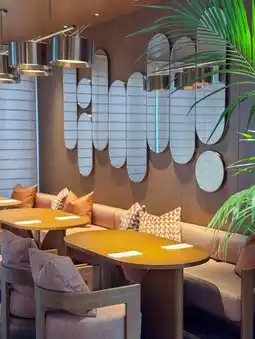 The open atrium and large windows offer sofa and terrace seating. The interior is luxurious