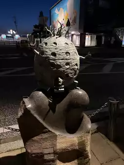 In the evening, I returned to Mizuki Shigeru Road. The street lights lit up, transforming into "Yokai Night." Each streetlight projected a different yokai, and the atmosphere shifted from the cuteness of daytime to mystery. The theme music playing along the way, along with the occasional catwoman's laughter, made me feel like I was transported to the world of anime. Under the night sky, Kitaro and his friends quietly guarded the town, creating a dreamy and heartwarming atmosphere.