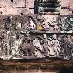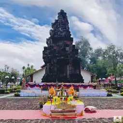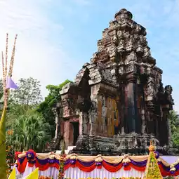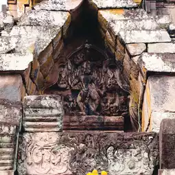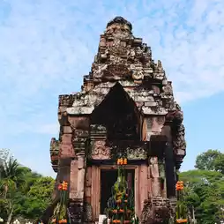 🙏It is an ancient site from the Khmer and Bapuan periods, built of sandstone on a laterite base. It stands out with a single prang, called “Narai Kha Yao” because the doors and arches are tall and long in the style of Khmer art from the 16th–17th Buddhist centuries. There are stone carvings of Vaishnava fairy tales, such as Narayana reclining on the ocean and Krishna subduing the lion, on the lintel and window arches.