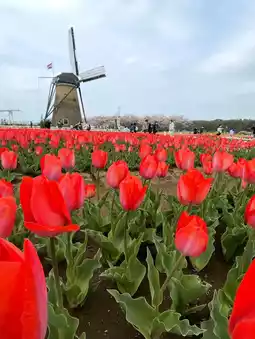 About 600,000 colorful tulips of about 100 varieties are in full bloom against the backdrop of the Dutch windmills.