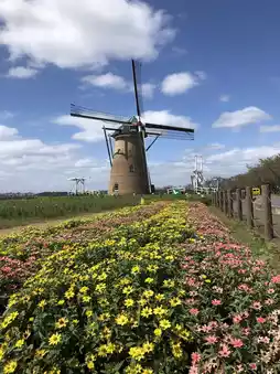 The Dutch windmill Liefde is a particularly noticeable sight even from the train, and seasonal flowers such as tulips🌷 in spring, sunflowers🌻 in summer, and cosmos🌸 in autumn are in full bloom.