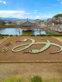 The large flower painting, 20m long and 25m wide, features this year's zodiac snake and the character for success🈴 and can be viewed for free from the observation deck♪
