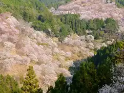 Mount Yoshino's cherry blossoms are also spectacular from in front of Yoshimizu Shrine, overlooking Kinpusenji Temple. The view in the opposite direction from Hitome Senbon is also truly spectacular, as expected. Kinpusenji's principal image, "Zao Gongen," was carved from cherry wood, and believers planted seedlings as sacred trees, which explains the abundance of cherry blossoms on Mount Yoshino. Most of the cherry trees are of the Hakusan cherry variety.