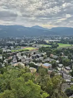 Hohensalzburg Fortress sits perched high on a hill, creating a stunning landscape with its walls and surrounding buildings in muted, antique colors. The view of Salzburg from the castle is a breathtaking sight. 🏘️🌇✨