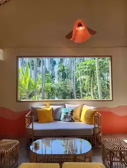 Cafe and restaurant in the garden, shady, lots of trees, many seating areas to choose from, many foreigners, people coming and going all the time, there is a small playground, suitable for coming with family, friends