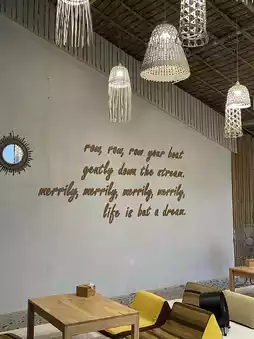 ร้านตั้งอยู่ใจกลางสวนมะนาว มะพร้าว และต้นหมาก บรรยากาศร่มรื่น ตกแต่งแบบมินิมอลโทนสีขาว สบายๆ เหมือนบ้านเพื่อน